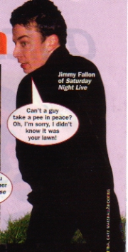| "WHY?! WHAT'S WRONG WITH KIDS?!" why?...that's my only question...why?...why do you have to ruin it?...becoming a true jimmy fallon fan is an honor...it takes serious effort, hard work, and a lot of time...you are abusing the word, girls...just because you saw jimmy fallon on the 2001 mma's in that sexy-ass cowboy suit, you think that you derserve to call yourself a fan?!...no way...sure, jimmy fallon may be incredibly nice on the eyes, but that's not all he's got going for him...of course, you wouldn't know that because you've never watched an episode of snl in your life...and you have no idea how hard he worked to get on that show...answer me this: can you name one movie that jimmy has been in?...didn't think so...now answer these...do you know how old (or should i say how young) he is?...do you know when his birthday is?...do you know where he was born?...do you know what college he went to?...do you know what comedy and acting groups he studied with?...do you know that he lived in LA?...do you know the name of the book he wrote with his equally talented sister, gloria?...omg!...he has a sister?...i know that's exactly what you're saying to yourself right this minute...now, admit it...you know nothing about him...either take the time to look at his story and discover the person behind that beautiful face, or turn your "omg! jimmy fallon's so hot!" screaming butt around, and go back to where ya done came from...cuz we Fallonatics don't need to be played like this...you do not know what being a fan is...i breathe jimmy fallon...i have every single episode of snl that he has been in on tape...i learned to play the guitar, just so that i could play his songs...i have 420 pictures of him saved on my computer...i pretty much have his book memorized...i've seen all of his talk show interviews...i pray everyday that i'll get to meet him...okay...i'm a little obssessed...but i can't help it...he is just so extraordinarily talented!!!...i'm not saying that i hate you teenyboppers...i just hate you're ignorance. |